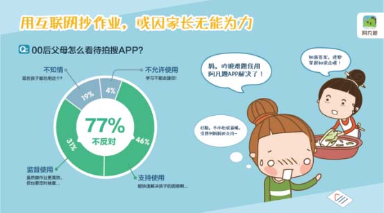 面對00后的作業難題,更多家長有苦難言,即使他們這一代受大專以上教育水平的人數比10年前增長近3倍,但是對于輔導孩子功課這件事,依然是力不從心,所以,支持或陪伴孩子使用互聯網學習工具成為了他們的主要選擇。據統計,77%的家長不反對使用拍搜APP,其中46%的家長認為“能快速解決孩子的困惑”;而考慮到未成年人自覺性欠缺,31%的家長選擇監督和陪伴使用;不允許孩子使用拍照搜題的家長僅為4%。
