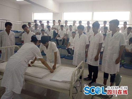 昨(29)日,記者來到四川中醫藥高等專科學校實驗室看到,教室里滿滿的男生,在老師的指導下,他們正在學習最基礎的課程——準備用物,小小的病床就成了他們的主戰場。