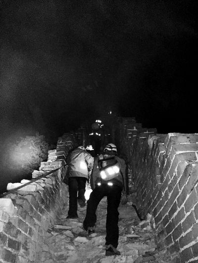 昨晚8點(diǎn)半左右,接到救援電話后,綠舟應(yīng)急救援隊(duì)派出了3名最富經(jīng)驗(yàn)的老隊(duì)員趕往箭扣長城。這些隊(duì)員對地形相對熟悉,并且都在箭扣地區(qū)參與過十幾次的營救行動(dòng)。可即便是這樣,因?yàn)樘鞖庠颍仍藛T在搜尋的過程中依然困難重重。