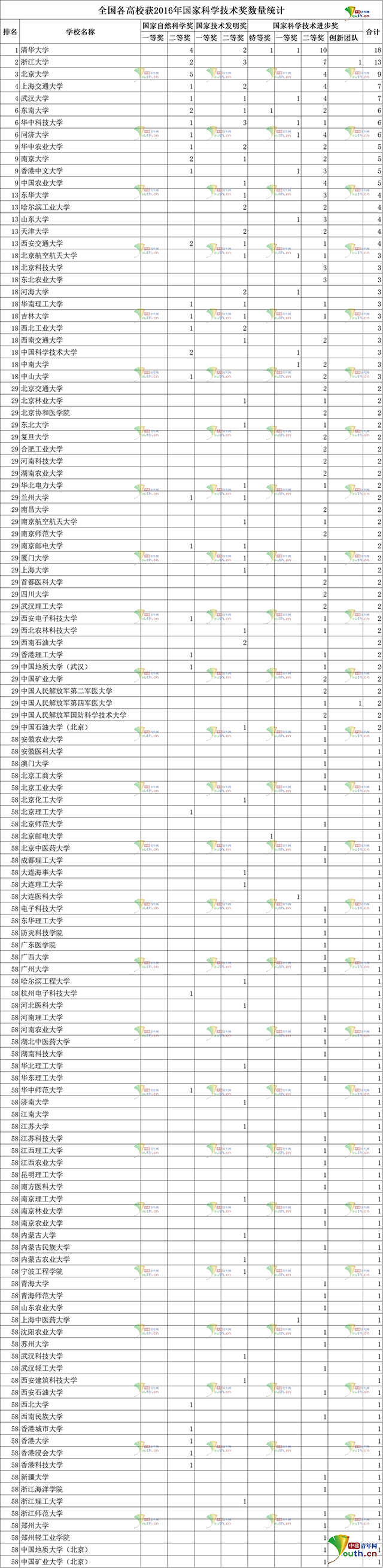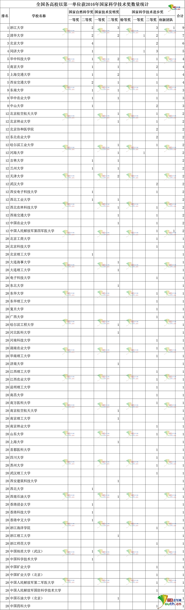 據(jù)中國(guó)青年網(wǎng)統(tǒng)計(jì),133所獲獎(jiǎng)高校中有75所高校作為第一完成單位獲獎(jiǎng),其中,浙江大學(xué)有9個(gè)獎(jiǎng)項(xiàng),位居第一;清華大學(xué)(7個(gè))和北京大學(xué)(6個(gè))分列第二位和第三位;同濟(jì)大學(xué)(5個(gè))、華中科技大學(xué)(4個(gè))、南京大學(xué)(4個(gè))、上海交通大學(xué)(4個(gè))、西安交通大學(xué)(4個(gè))、東南大學(xué)(3個(gè))、華中農(nóng)業(yè)大學(xué)(3個(gè))、中山大學(xué)(3個(gè))等8所高校也進(jìn)入前十名。