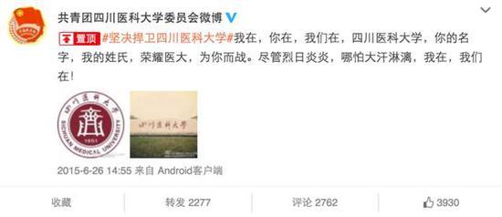 在瀘州醫學院一方,微博上出現了#堅決捍衛四川醫科大學#的話題:“2015.4 我校合理、合法、合規的更名為四川醫科大學。新校名授牌儀式完成,四川大學華西醫學中心一改最初恭喜祝賀的態度,強烈反對。6 月 26 日全校學子在校內集體發起訴求:堅決捍衛四川醫科大學!”