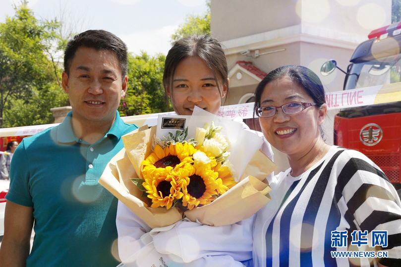 6月7日上午11點40左右,在青海省西寧市第二中學考場,語文結束后,等候在外的考生父母為考試結束的孩子送上了鮮花。(新華網青海頻道王小龍 攝)
