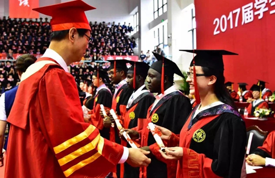 6月14日,西北師范大學2017屆學生畢業典禮舉行。校長劉仲奎為每一位畢業生撥穗正冠,并合影留念。李亞妮/攝
