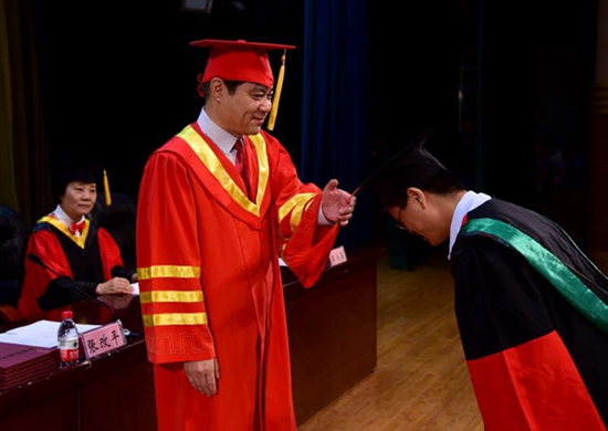 6月14日,河南農業大學舉行2017年畢業典禮暨學位授予儀式,圖為中國工程院院士、河南農大校長張改平為畢業生撥穗。周紅飛/攝