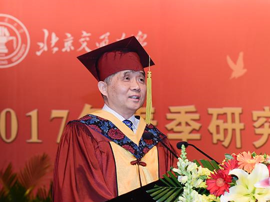 今天,對于北京交通大學和各位畢業生來講,都是一個值得紀念的日子!今天,北京交通大學2017屆的189位博士生、2115位碩士生即將走出校園,開始人生新的旅程。在此,我謹代表北京交通大學,向順利完成學業的畢業生同學們致以熱烈的祝賀,向長期辛勤工作在研究生培養一線的各位老師致以衷心的感謝,向辛勤培育你們的父母、親人致以崇高的敬意!