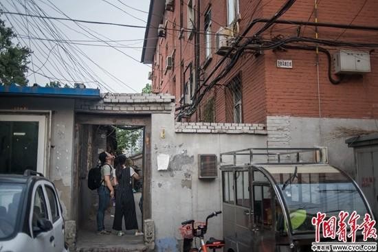 7月1日,北外研究生畢業的何純陽(左)和朋友在北京二環內一老式單元樓外看房。