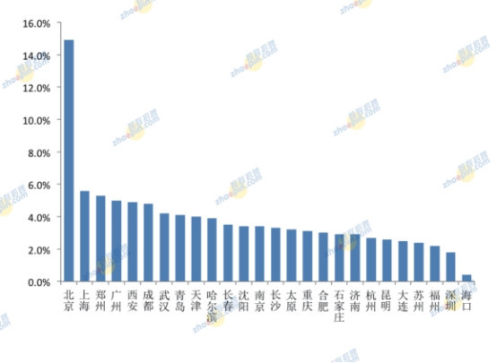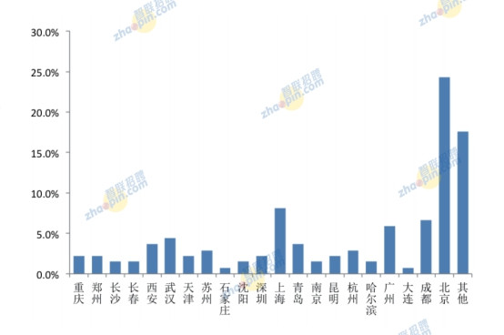從海歸出生地來看,北京穩居首位,且比例遠遠超過其它地方。上海、鄭州、廣州、西安、成都居前六位。其它各城市占比依次遞減,但差距微小,且地域涵蓋我國東、中、西各地區。
