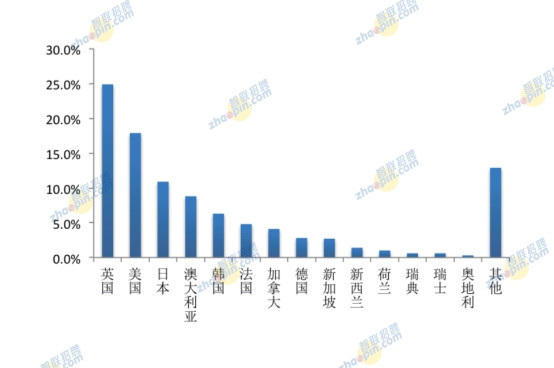 在最近一次的留學國家分布比例來看,英國、美國、日本、澳大利亞、韓國位列前五名,占比分別為24.9%、17.9%、10.9%。8.8%、6.3%,以上國家是我國留學生的主要目的地國,擁有全球優質教育資源。法國和加拿大的占比也均超過4%。其他國家占比均低于3%。