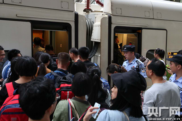 圖為武漢鐵路公安處漢口車站派出所民警在車門口盯控。