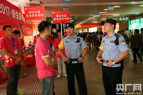 圖為武漢鐵路公安處民警在高校大學(xué)生接站點(diǎn)了解情況。