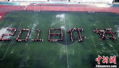 圖為千余名大學生拼出“2018你好”字樣迎新年。司新利 攝