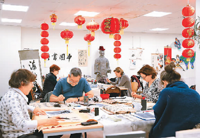 在比利時布魯塞爾的孔子學院,學員們練習中國書法。新華社記者葉平凡攝