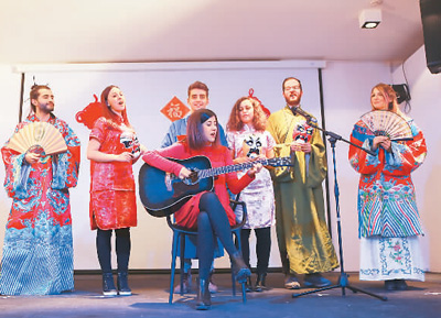 意大利那不勒斯東方大學孔子學院組織迎新春活動,低年級學生唱跳《新年好》。