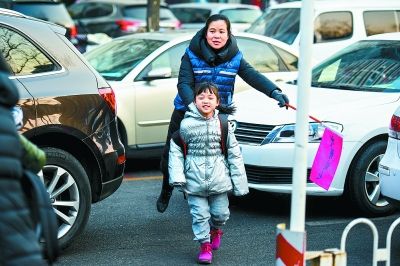 昨晨,中關村三小南校區門前,家長志愿者正在幫助小學生過馬路。記者 鄧偉攝