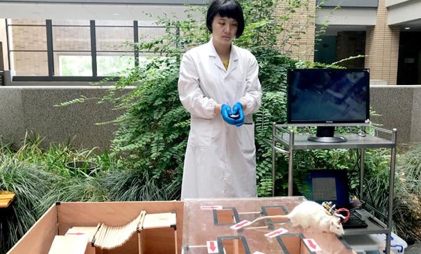 浙江大學求是高等研究院老師俞超楠演示通過微電刺激大鼠的感覺皮層產生虛擬觸覺實現對大鼠機器人轉向行為的控制。(謝沂楠攝)