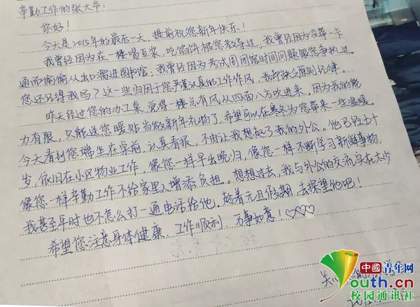 學(xué)生寫給張景海的信。中國(guó)青年網(wǎng)通訊員 劉積舜 攝