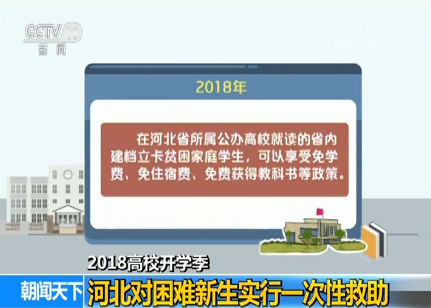 今年,在河北省內就讀的河北省建檔立卡貧困家庭學生,可以享受免學費、免住宿費、免費獲得教科書等政策。從2018年秋季學期開始,河北省還對參加高考并被全日制普通高等院校錄取、具有河北省戶籍的家庭經(jīng)濟特別困難學生實行一次性救助。一次性救助標準是每生2000-3000元,主要解決大學新生報到的路費、學校助學金發(fā)放前的生活費等。