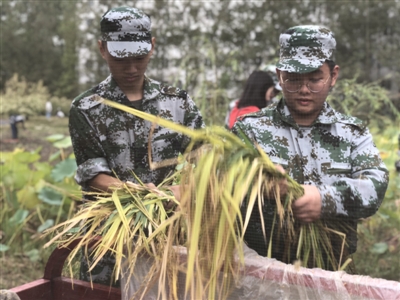 據介紹,川大錦城這一片金燦燦的稻谷于今年4月栽種,經過了幾個月生長,迎來了大豐收,“這是我們自己種的,現在自己來收割,感覺特別有意義。”結束了上午軍訓的大一學生也來到了現場,幫忙打谷子。