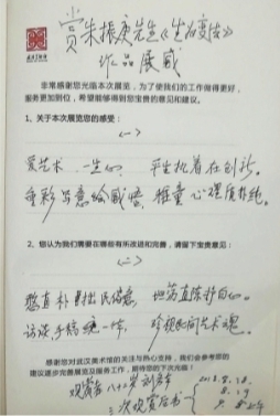 十年間,劉務本給武漢美術館大大小小的畫展寫了近百條留言,其原則是“取共性,存異性,尊重藝術家的人格和風格。”因為真誠獨到的點評,她在武漢藝術圈也小有名氣,藝術家陳立言、謝申等曾親自到她家中拜訪交流。