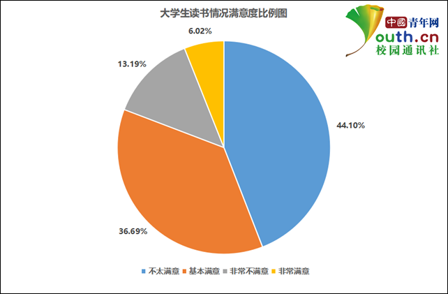 調(diào)查顯示,有44.1%的受訪學(xué)生對自己讀書情況不太滿意,36.69%的受訪學(xué)生基本滿意,認(rèn)為非常不滿意和非常滿意的分別為13.19%和6.02%。