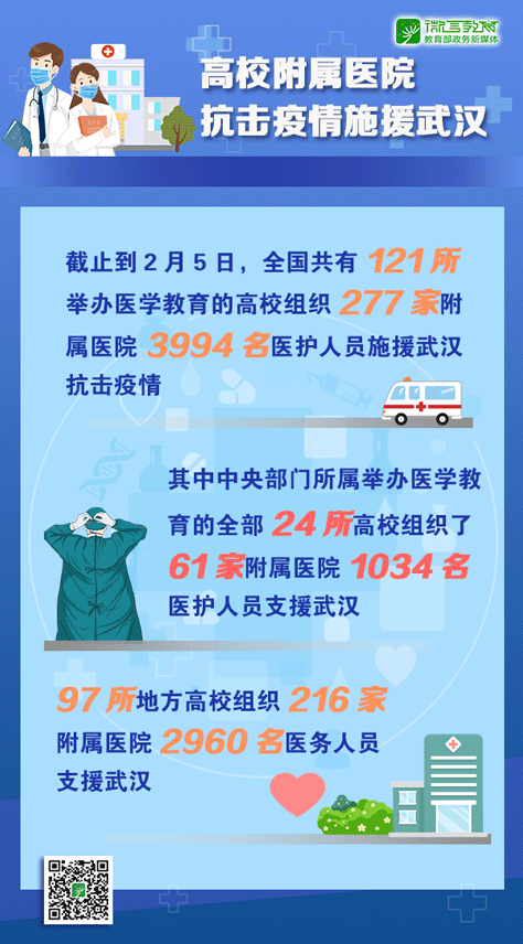 截止到2月5日,全國共有121所舉辦醫學教育的高校組織277家附屬醫院3994名醫護人員施援武漢抗擊疫情,其中中央部門所屬舉辦醫學教育的全部24所高校組織了61家附屬醫院1034名醫護人員支援武漢;97所地方高校組織216家附屬醫院2960名醫務人員支援武漢。此外,全國高校的350余家附屬醫院按照當地衛生健康部門的統一部署,全部投入到當地疫情防控工作。