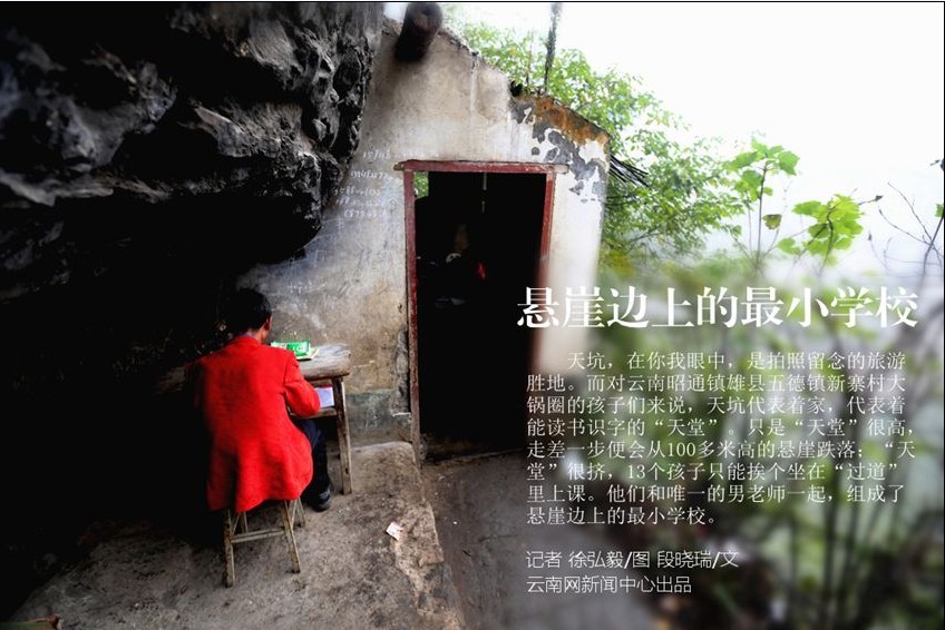 大鍋圈位于云南昭通鎮(zhèn)雄縣五德鎮(zhèn)新寨村,屬天然“天坑”,平均深度120米,最深處達(dá)150米,絕壁陡峭險峻。教室不遠(yuǎn)處僅有的空地便是孩子們課間玩樂的場所,與記者的小心翼翼相比,孩子們面對懸崖早已習(xí)以為常。