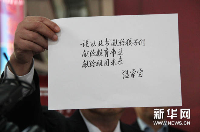 10月31日,《溫家寶談教育》新書首發式在北京西單圖書大廈舉行。主辦方展示了溫家寶同志親筆寫下的出版寄語。新華網 王志艷 攝