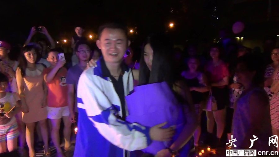 就在這時,伴隨著《做我老婆好不好》的音樂,身穿高中校服的男主角毛先生站在蠟燭圈中,單膝跪地,手捧99朵玫瑰,對女友李小姐說:“我今天向你求婚,天太熱了,我受不了了,你答應(yīng)我吧!”與此同時,女友將手伸到毛先生面前,一枚戒指滑向指間,圍觀的親友及市民連連拍手叫好。正在廣場上散步的多位市民見證了這個求婚的全過程,不禁感嘆:“如今的年輕人還真浪漫啊。”