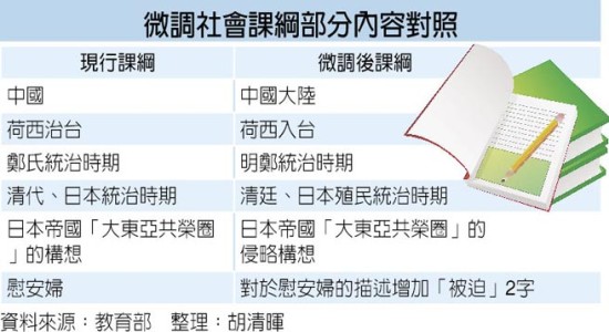 臺(tái)“教育部”微調(diào)臺(tái)高中國文、社會(huì)科課綱,27日召開“12年國教”課程審議會(huì),確定把“中國”改為“中國大陸”,同時(shí),“日本統(tǒng)治時(shí)期”改為“日本殖民統(tǒng)治時(shí)期”,對(duì)于慰安婦的描述增加“被迫”2字。臺(tái)“教育部”強(qiáng)調(diào),課綱微調(diào)是中性的呈現(xiàn)歷史,將于2015學(xué)年度的高一新生適用。
