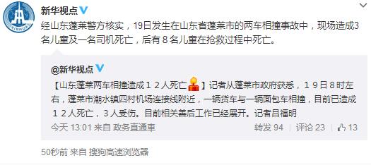 據新華視點微博消息,經山東蓬萊警方核實,19日發生在山東省蓬萊市的兩車相撞事故中,現場造成3名兒童及一名司機死亡,后有8名兒童在搶救過程中死亡。