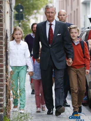 當地時間2013年9月2日,比利時布魯塞爾,開學季到來,比利時國王菲利普陪同兒女到學校報到。