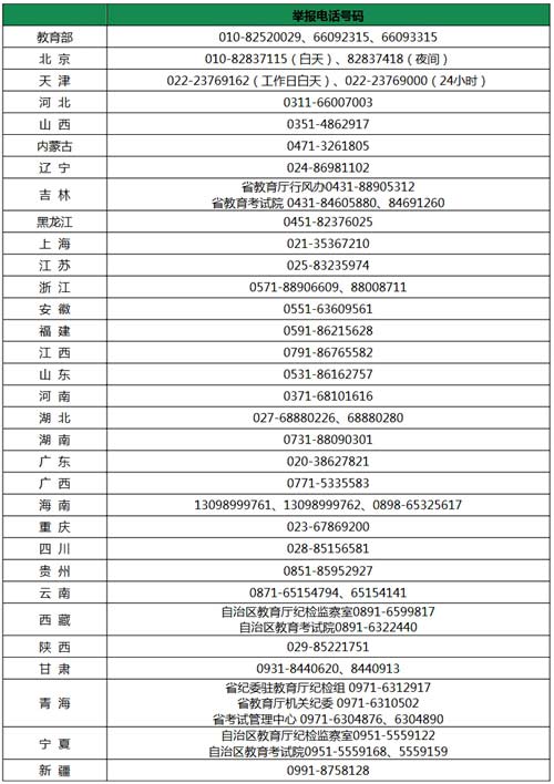 人民網北京6月2日電(記者賀迎春) 近日,教育部統一部署協調全國31個省(區、市)教育行政部門和招生考試機構開通了2016年高考舉報電話。