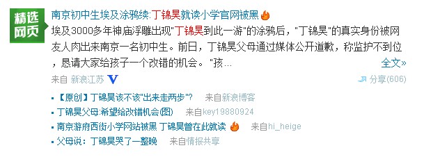 在5月24日丁錦昊“到此一游”事件曝光后,輿論引起軒然大波。至5月25日晚11點,評論已達11000多條,轉(zhuǎn)發(fā)達到83000多條,網(wǎng)上的相關評論則達數(shù)十萬條,而主題詞就是中國游客的“素質(zhì)”。在譴責這種不文明行為的同時,也有網(wǎng)友“人肉”出,丁錦昊是南京某中學在讀的初一學生等個人信息。而網(wǎng)友對于丁錦輝的聲討更是一浪高過一浪。 5月25日,丁錦昊的父母主動站出來發(fā)聲,在為孩子的行為道歉的同時,也懇請得到改正的機會,并透露,題字風波發(fā)酵后,孩子哭了一整夜。至此,丁錦昊“到此一游”事件算是暫時告一段亂。