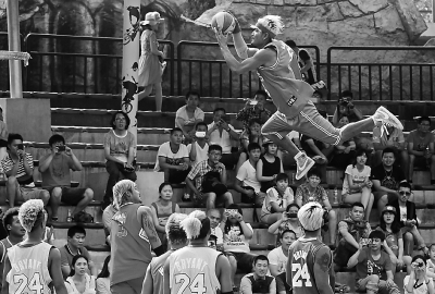 端午小長假期間,在歡樂谷籃球廣場舉行的室外籃球表演賽,讓游客們大飽眼福。本報記者 戴冰攝