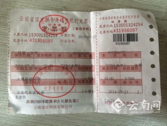 昆明北部汽車客運(yùn)站副站長丁虎告訴記者:“不論是在客運(yùn)站售票廳,還是在其他的車票代售處,昆明五個汽車客運(yùn)站所用車票統(tǒng)一都是云南省國家稅務(wù)局通用機(jī)打發(fā)票,手寫車票絕對是假的。”