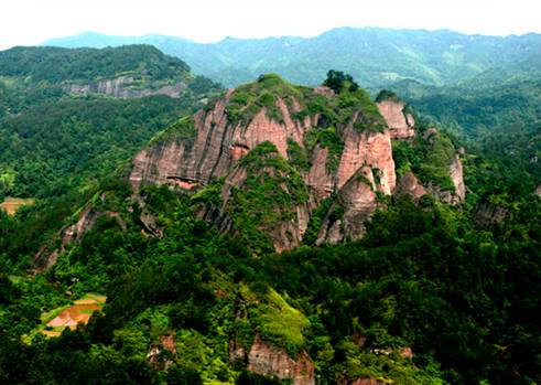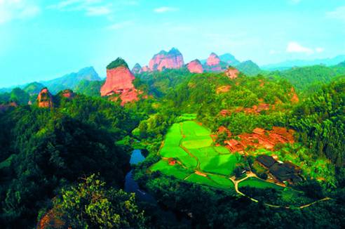 她位于湖南湘西通道縣城東北部。不是很高,也不是很陡峭,她的獨特之處就是在于,頭上頂綠帽子,上身穿紅裙子,下身套著花褲子,腳上踩著綠鞋子。她是我國乃至世界范圍內發現的品相較為罕見的特大型丹霞地貌群。