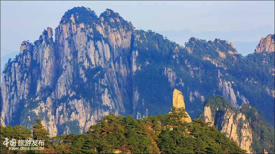 峰石在云海烘托下,把黃山幻化成亦真亦幻人間仙境。讓人不由想起明代馮夢幀《初霽登煉丹峰》詩句:“聳身到峰頂,下界煙蒙蒙。環坐松石間,翠色澄心胸。霧消山遞呈,青紫殫妍容。安得乘日車,踏遍高低峰。”