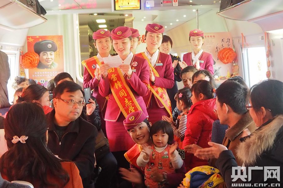 2015年3月5日北京鐵路局在G13次北京南—上海虹橋的旅客列車上開展《弘揚雷鋒精神 共建文明家園》主題活動。圖為:乘務員與旅客同唱雷鋒歌曲。(央廣網記者何微攝)