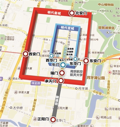 明代皇城范圍,東起今南京機(jī)電學(xué)校與南京博物院以西一線,西至竺橋、逸仙橋一線,南到光華門,北至佛心橋。南北長2.5公里,東西寬2公里,周長9公里。