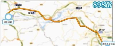 根據線路走向,898路從地鐵朱辛莊站出發不遠處就可以上京藏高速,中途不設站,直接到達涿鹿。高速路段公里數超過百公里。此外,880路由目前首末站華僑農場-德勝門,調整為沙城客運站-地鐵朱辛莊站;880快由康莊-德勝門,調整為沙城客運站-地鐵回龍觀站。調整后,德勝門地區這兩條公交線路將外遷,也將加強張家口懷來縣與北京的快速交通聯系。