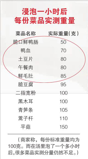 幾日后,北京商報記者以普通顧客身份再次前往姑姑宴國瑞中心店,按照此前馬女士一行人所選購的冒菜重新點了一份,打包帶回后進行了稱重。盡管路上花費了一個多小時,但在湯水里泡了許久的脆口鮮鴨腸、脆豆腐、鮮毛肚、鴨血、寬粉、午餐肉等分量仍然不足,鴨腸只有50克、鴨血70克、土豆片也只有80克。除了平菇,其他幾種菜也只是剛夠量(詳見表格)。