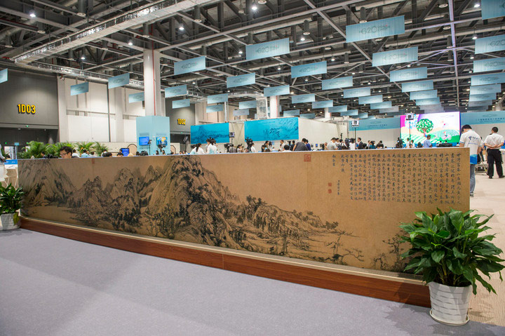 新聞中心檔板上的《富春山居圖》被譽為“中國十大傳世名畫”之一,是元代畫家黃公望的代表作,以浙江富春江為背景,全圖用墨淡雅,山和水的布置疏密得當,墨色濃淡干濕并用,極富于變化。明朝末年傳到收藏家吳洪裕手中,吳洪裕極為喜愛此畫,甚至在臨死前下令將此畫焚燒殉葬,被吳洪裕的侄子從火中搶救出,但此時畫已被燒成一大一小兩段。較長的后段稱《無用師卷》,現藏臺北故宮博物院;前段稱《剩山圖》,現收藏于浙江省博物館。
