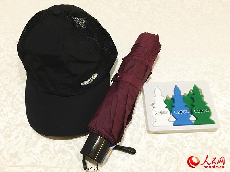 G20媒體包中的帽子、傘以及冰箱貼(人民網記者賈興鵬攝)