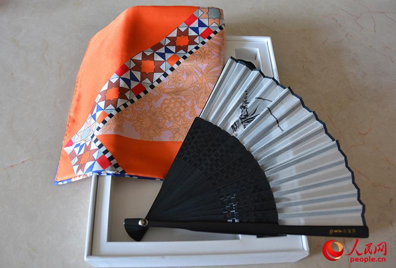 G20媒體包中的杭扇與絲巾(人民網記者夏曉倫攝)