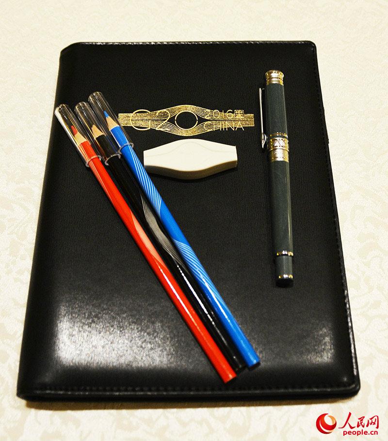 黑色皮革的筆記本,印著燙金G20標志。紅藍黑三色木質鉛筆,搭配著白色小清新橡皮。