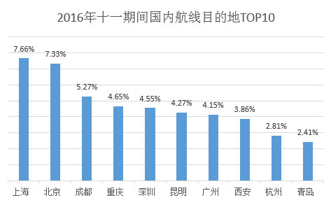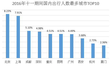 十一期間,哪兒的人出行指數最高?作為首都的北京當仁不讓,上海緊隨其后。北、上、廣、深這四個超一線城市的出游人數均位列前十名。喜歡安逸的成都人同樣也是十一出游的愛好者,以5.1%的占比排名第三位。專家分析,隨著二線城市居民GDP的提升,收入的增加、機票價格的下降,越來越多二線城市加入到乘機出游的大軍里來。