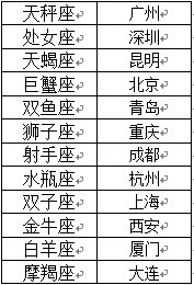 國內城市中哪些是十二星座的最愛?據統計,飲食文化源遠流長的廣州是天秤座的最愛,距離香港、澳門很近的深圳成了處女寶寶的選擇,四季如春的昆明是天蝎座的度假勝地,喜歡全家一起出行的巨蟹寶寶更偏愛老少咸宜的首都北京,愛浪漫的雙魚座則是更多地選擇了既有異域風格又能吹海風的雙魚座。