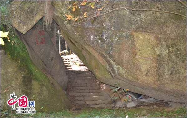 只見梅屋門前(洞口),松竹哨兵左右列隊,菩提滄桑,兩巨大巍峨的石頭“人”字相靠支撐起一個約有20平米的通透大洞竇。下三四石階,進到洞里,涼氣逼人。洞里左邊靠洞壁處有方便探幽尋訪者休憩的石塊。偶見丟棄的飲料瓶蓋等給人感覺這里不缺少生活氣息。直行出洞,石條小橋橫跨溪流,天地豁然開闊,天造地設,修身養性絕佳去處。