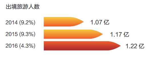 2016年,在收入增長和旅游消費升級推動,以及簽證、航班等便利因素影響下,我國出境旅游熱依然持續(xù),出境旅游人數(shù)達1.22 億人次,比2015年的1.17億人次增長4.3%,繼續(xù)蟬聯(lián)全球出境旅游人次世界冠軍。