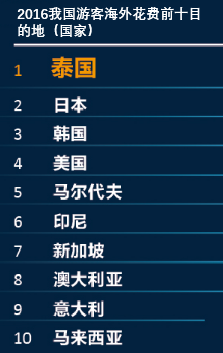 報告根據(jù)在線預(yù)訂數(shù)據(jù),發(fā)布了2016 年最受中國游客歡迎的二十大目的地國家,依次是:泰國、韓國、日本、印尼、新加坡、美國、馬來西亞、馬爾代夫、越南、菲律賓、柬埔寨、俄羅斯、澳大利亞、毛里求斯、意大利、阿聯(lián)酋、斯里蘭卡、英國、埃及和德國。